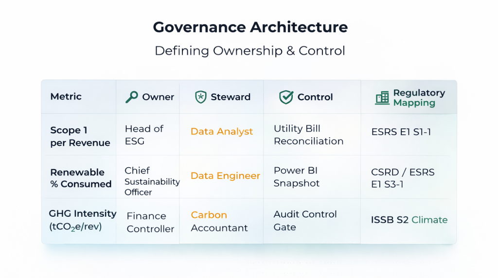 As sustainability disclosures become regulated, metrics must move from spreadsheets to controlled semantic layers with: